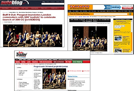 The day long stunt was designed to generate word of mouth around the launch of the new Peugeot 308CC and the nudes wore scarves to bring to life the USP of the car – an innovative Airwave Neck Heating System that keeps the driver warm whatever the weather.